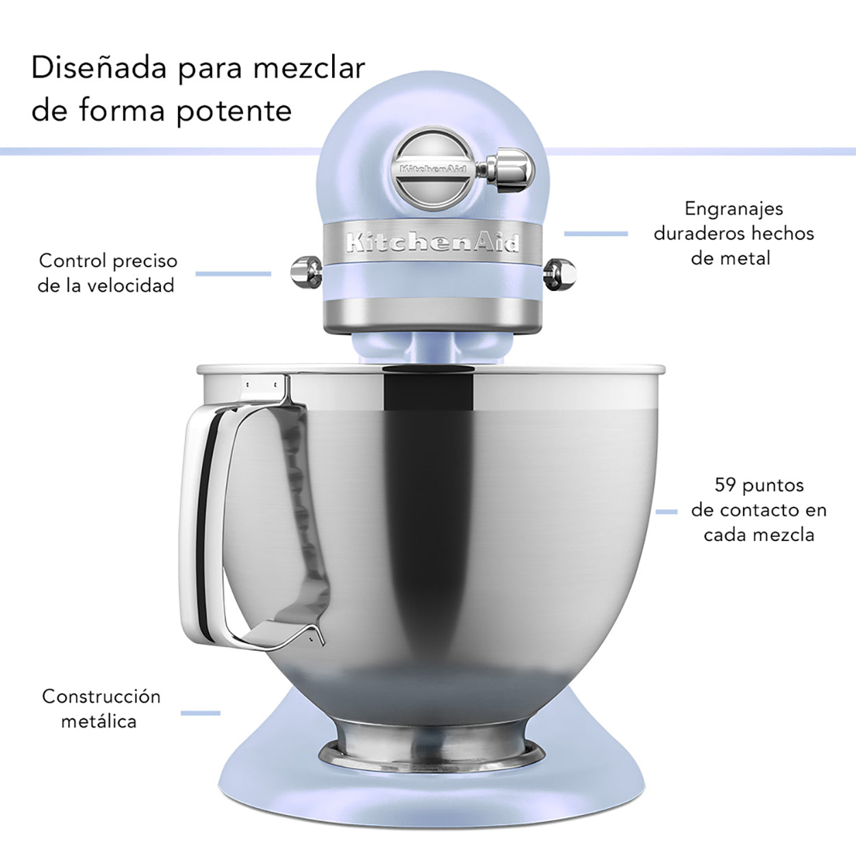 La acción de mezcla planetaria de 59 puntos significa 59 puntos de contacto por rotación alrededor del tazón para una incorporación completa de los ingredientes. El batidor, el gancho para masa o el látigo de alambre giran alrededor del tazón, brindando una cobertura increíble para un mezclado completo.