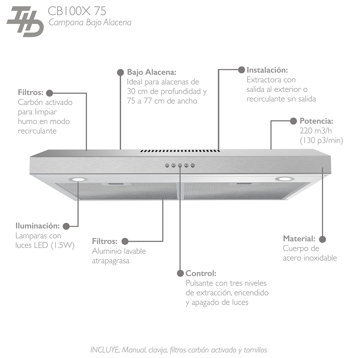 CAMPANA BAJO ALACENA IHD MODELO CB100X75 DE 75 CM EN ACERO INOXIDABLE