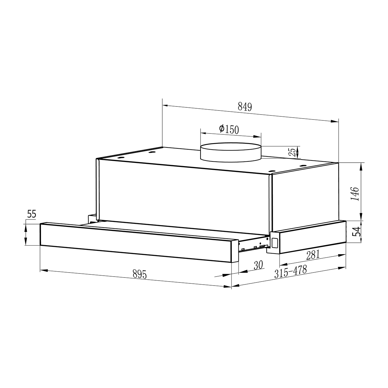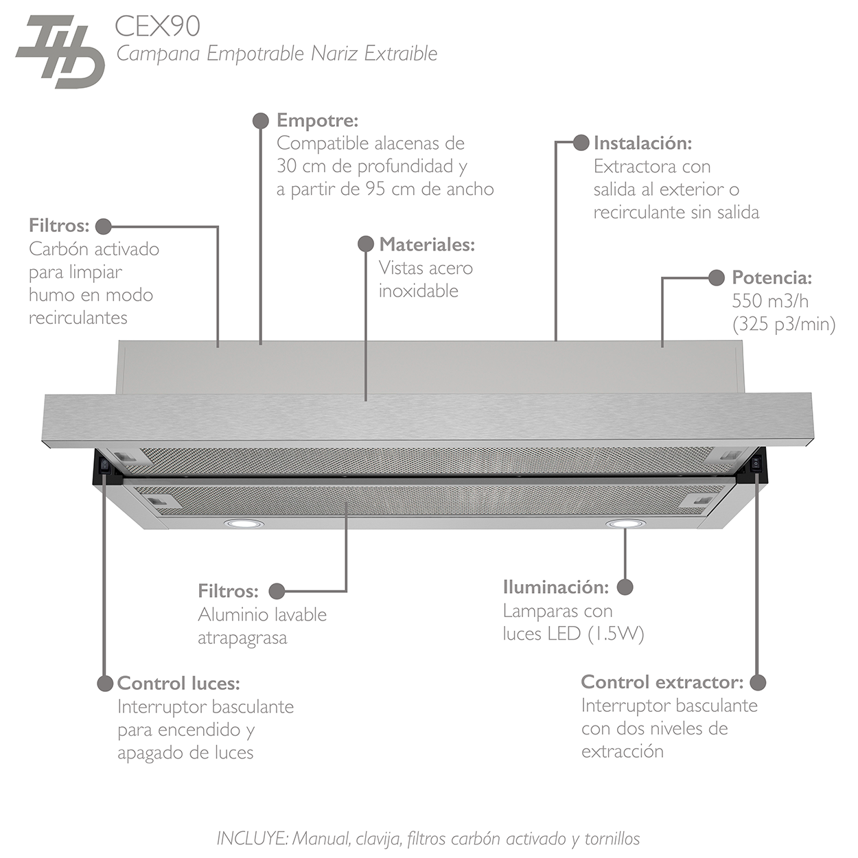 CAMPANA EMPOTRABLE EXTRAIBLE IHD MODELO CEX90 DE 89.5 CM EN ACERO INOXIDABLE