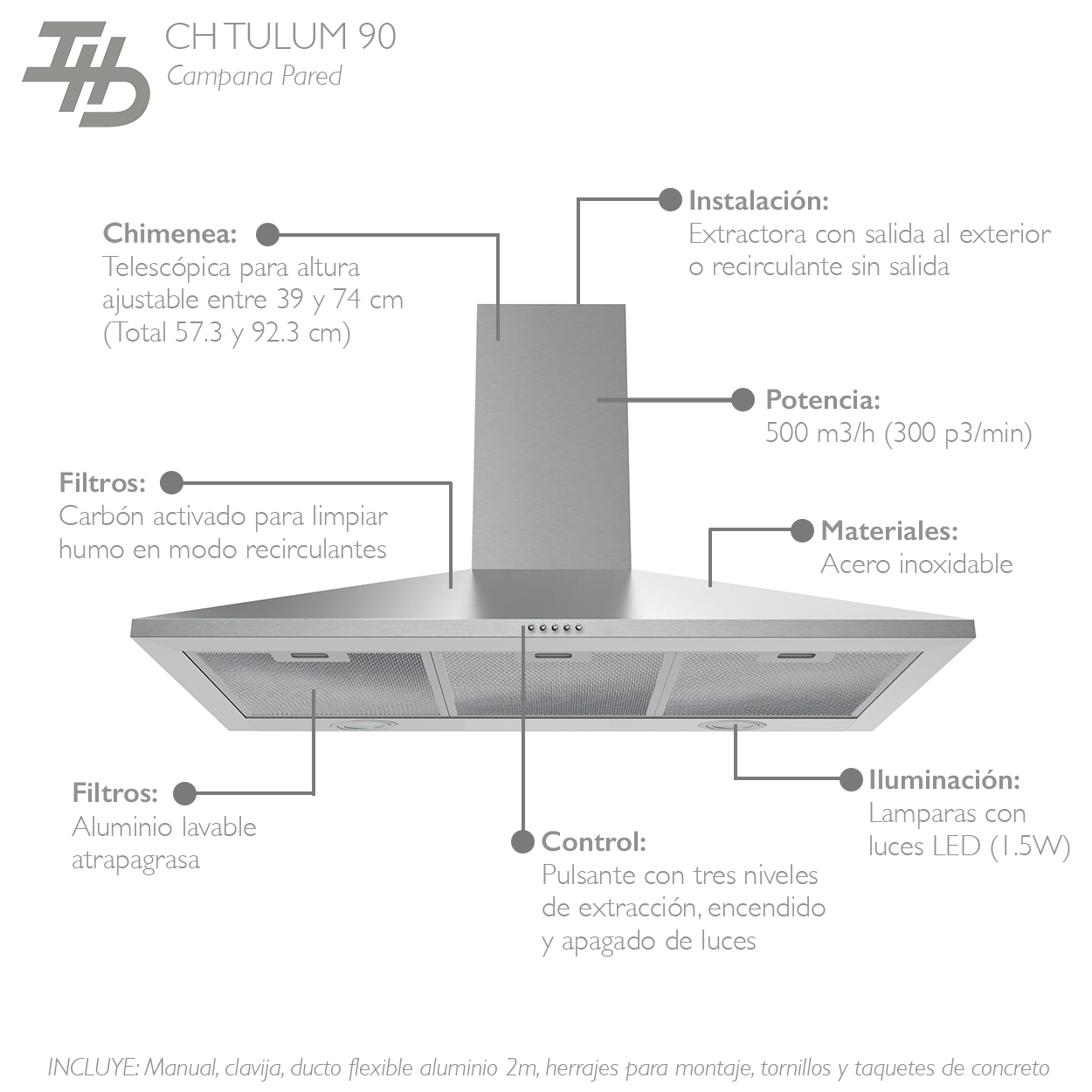 Campana de Pared IHD CH TULUM 90 de 90 cm (36 pulgadas) con Filtros Purificadores en Acero Inoxidable