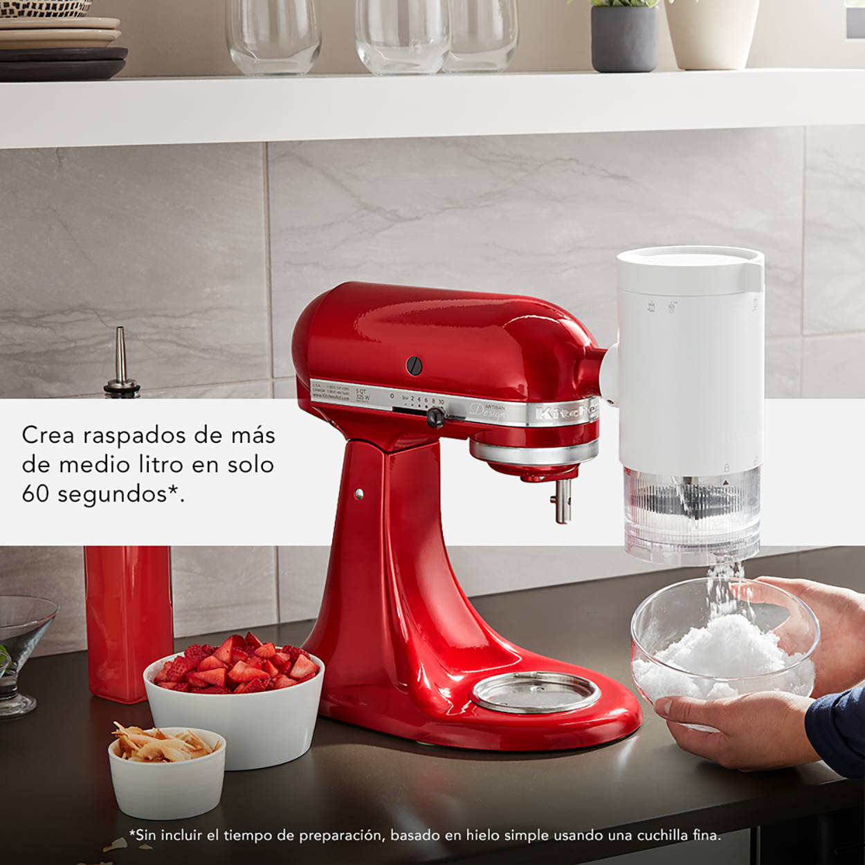 Funciona con todas las Batidoras KitchenAid. Conecta a cualquier Batidora KitchenAid* y utiliza la potencia del motor para crear fácilmente una textura de raspado de hielo similar a la nieve. *Se vende por separado.