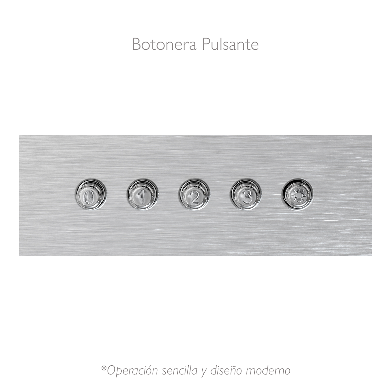 Panel de control intuitivo con 5 botones para selección de 3 niveles de intensidad de extracción y encendido/apagado de luces.